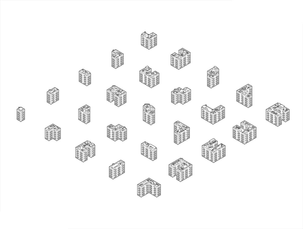 A set of 300 Isometric Building Drawings, split in 6 typologies, 25 different distributions and 2 densities (5 and 2 story building).